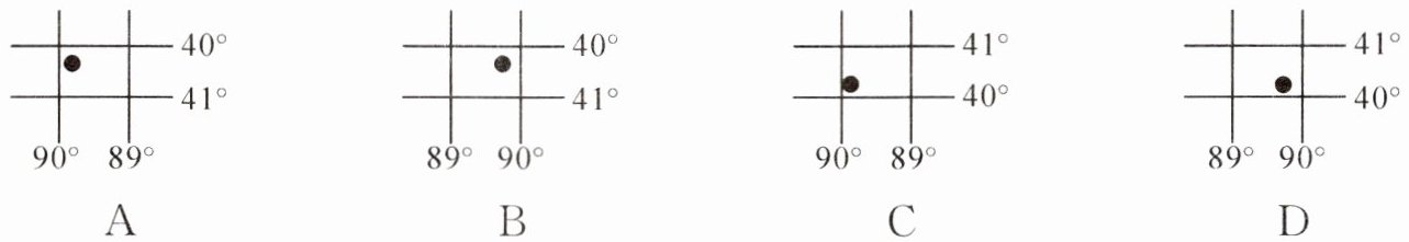 4. (2024·牡丹江)我国古代楼兰文明早已消逝在浩瀚的荒漠中。经考证,楼兰古城位于(40°29′55″N,89°55′22″E)。下列经纬网图能够表示其大致位置的是( )