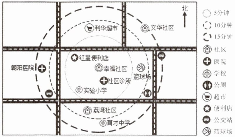 9.从幸福社区到红星便利店按直线步行需要 ( )