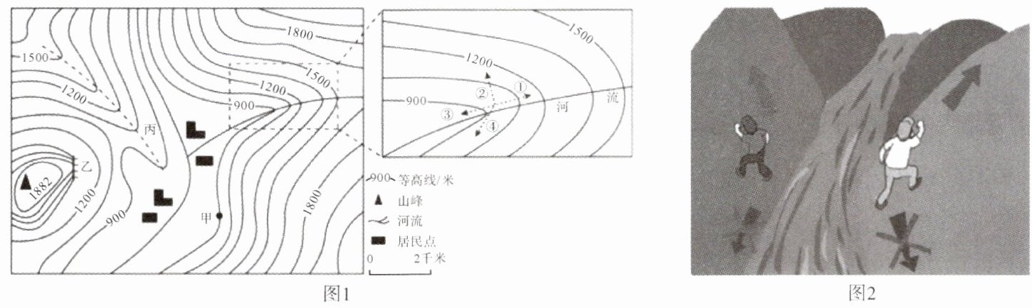 1为某地等高线地形图,图2示意泥石流发生时正确的逃生方向。据此完成8~10题。