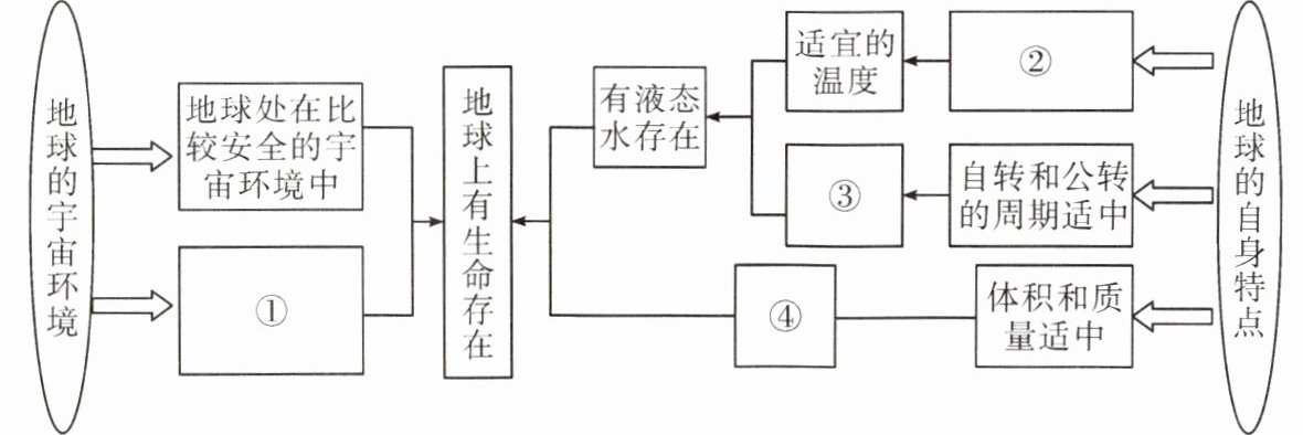 (4)目前,地球是太阳系中唯一存在高级智慧生命的天体。按照相互关系,将下列字母填在横线上,完成下图。