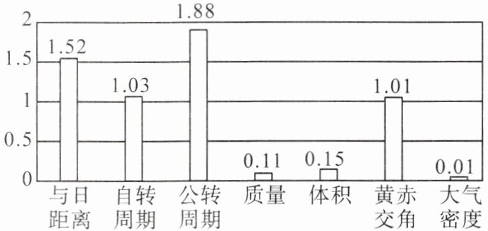 【例】近期研究发现,火星表面有干涸的河床。我国于北京时间2020年7月23日12时41分,在文昌航天发射场成功发射天问一号火星探测器。探测器7个月后飞抵火星,标志着我国自主开展行星探测迈出了第一步。读火星与地球数据比较(均以地球为1)图,完成(1)(2)题。