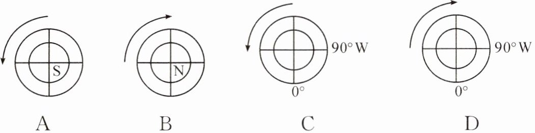 解析:本题考查地球自转的方向。解答本题的关键点是:地球自西向东自转。从北极上空看,地球呈逆时针方向自转;从南极上空看,地球呈顺时针方向自转。根据图中标注的字母分析地球自转方向。A项图中字母为S,其为南极,地球自转方向应是顺时针;B项图中字母为N,其为北极,地球自转方向应是逆时针。假定图中所画地球自转方向正确,分析其标注经度正误。C项图中地球呈逆时针方向自转,即以北极为中心,根据地球自转方向,$90^{\circ}W应该是90^{\circ}E$,故地球自转方向标注错误;D项图中地球呈顺时针方向自转,即以南极为中心,根据地球自转方向,$0^{\circ}经线和90^{\circ}W$经线标注正确。