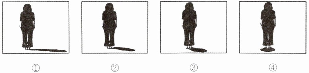 暑假,安徽省宿州市$(33.6^{\circ}N)$某中学地理实践小组进行研究性学习,下图是他们在校园内给老师拍摄的四张从清晨到正午的背影照片,拍摄时双方站立位置不变。读图完成5~7题。