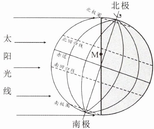 现极夜,可判断此时是北半球的冬至日。太阳直射南回归线,M地(北半球)处于冬季,
