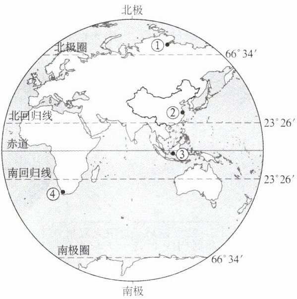 D.北半球冬至日,④地漫漫长夜,终日不见太阳
