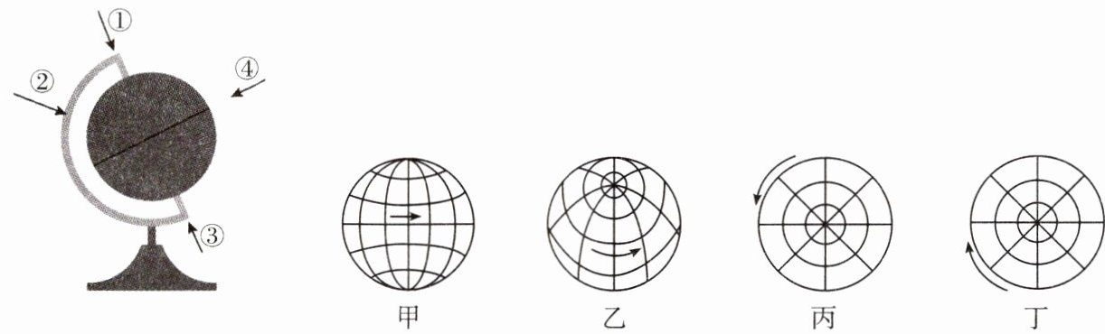 1. 下图中的①②③④箭头表示从不同方向观察地球仪演示地球的自转。这四个方向观察所见的经纬网形状和自转方向与右边甲、乙、丙、丁四图对应一致的是( )