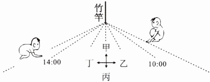 一天中竹竿影子的长度变化与天空中太阳的位置密切相关,家住$40^{\circ}N$的小明同学在春分日当天,测量竹竿影子的变化,并在地面做好记录(如下图)。据此回答13、14题。