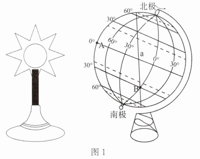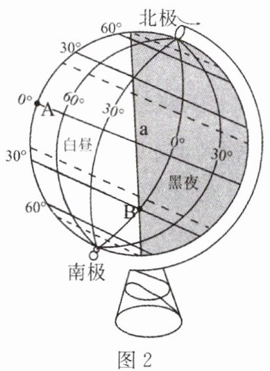 (1)图1中,根据地球自转方向拨动地球仪,判断a是______(选填“晨线”或“昏线”),A、B两地逐次由______(选填“白昼”或“黑夜”)进入______(选填“白昼”或“黑夜”)。