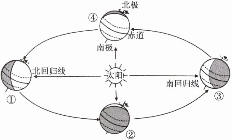 (2)6月22日前后,地球位于公转轨道的______(填序号)处附近,此时北半球节气是______(节气)。