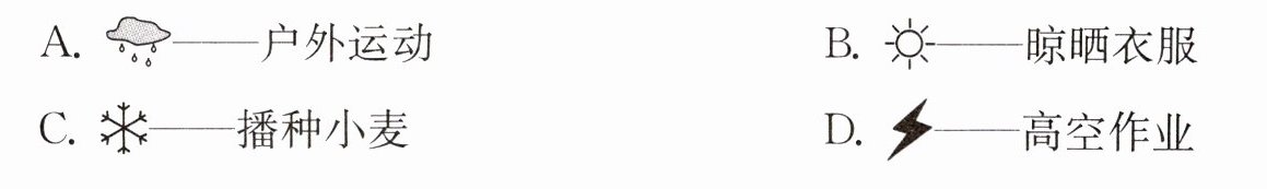 解析:解答本题的关键是要记住常见的天气符号。代表雷阵雨天气,不适合高空作业;代表沙尘暴天气,不适宜出行;代表中雪天气,不适合播种小麦;代表大雨天气,不适合晾晒衣服。故选B项。