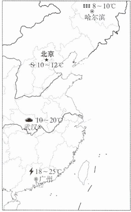 9. 读我国春季某日东部地区部分城市天气预报图,回答下列问题。