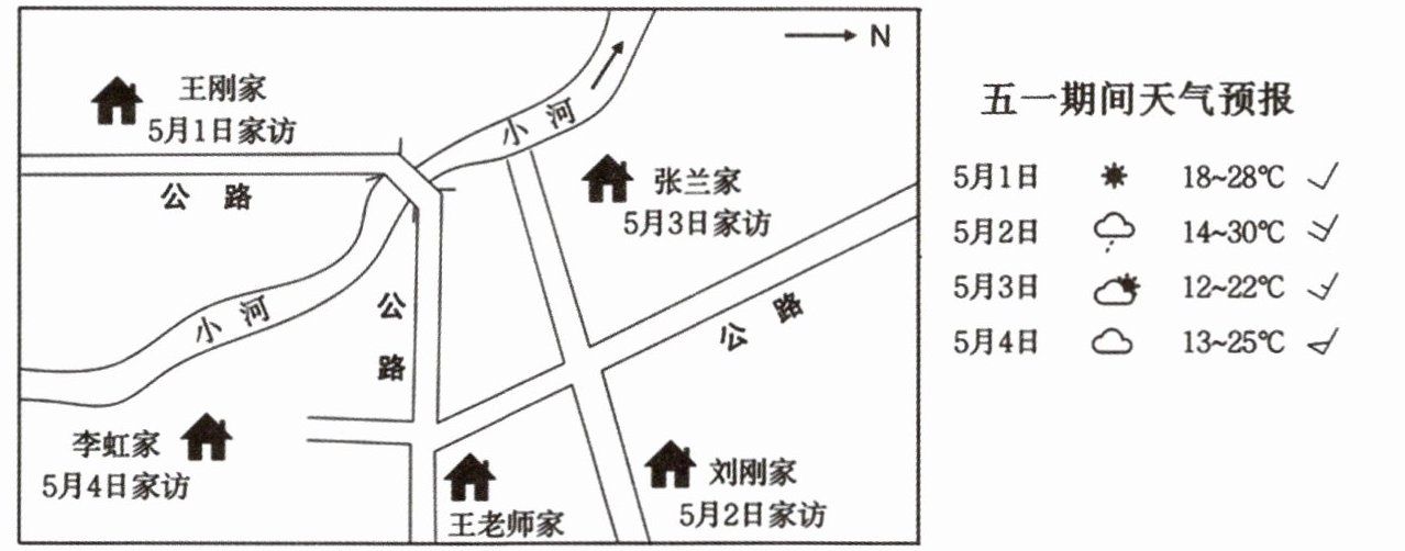 烟台王老师五一期间进行了一次家访活动。读王老师家访行程示意图及五一期间天气预报,完成5~7题。