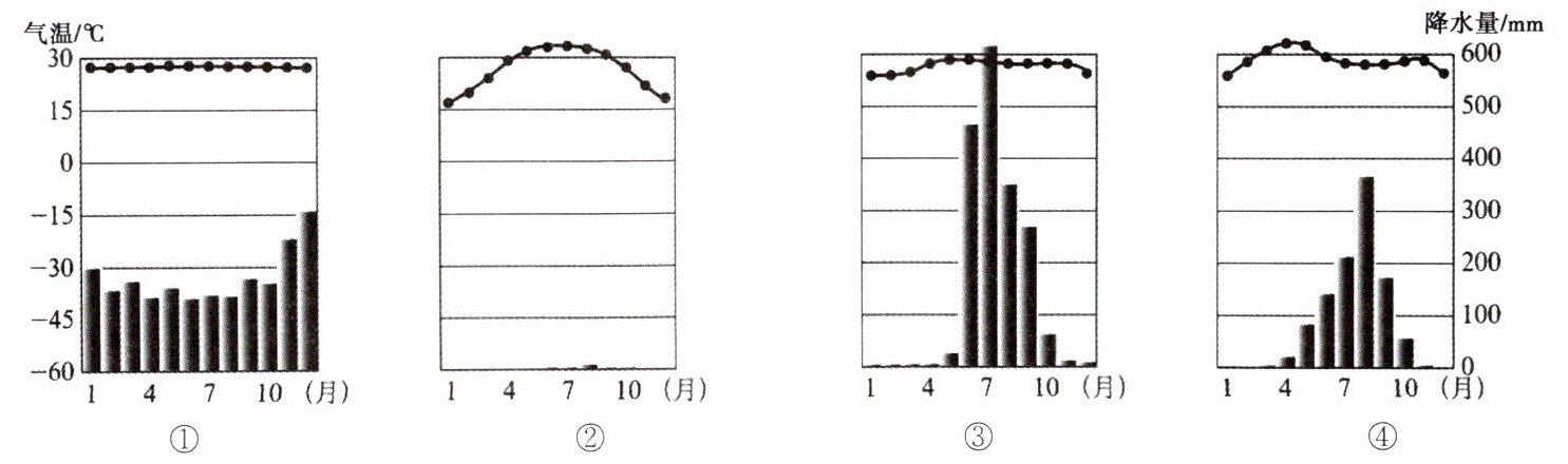 解析; 读图可知,①气候全年多雨,②气候全年少雨,③气候旱季和雨季明显,
