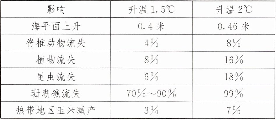 |影响|升温 $1.5^{\circ}C$|升温 $2^{\circ}C$|