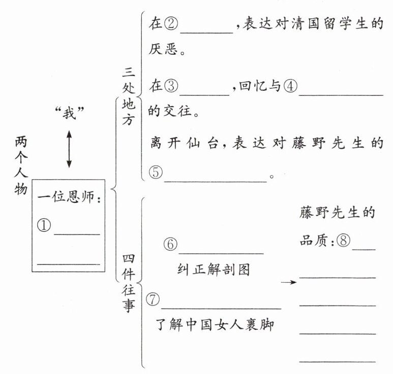 ①藤野先生 ②东京 ③仙台 ④藤野先生 ⑤怀念与赞扬 ⑥添改讲义 ⑦关心解剖实习 ⑧认真负责、治学严谨、热情诚恳、求实精神