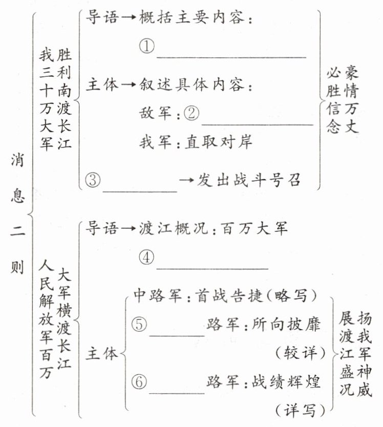①我军胜利渡江 ②纷纷溃退 ③结语 ④横渡长江 ⑤西 ⑥东