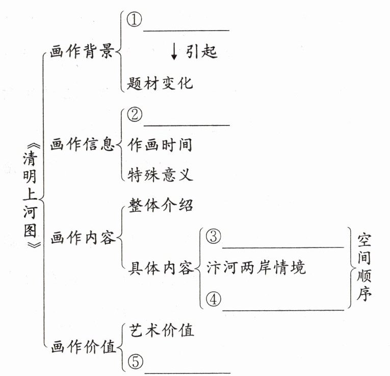 ①商业繁荣 ②介绍作者 ③汴京近郊风光 ④汴梁市区街道 ⑤历史价值