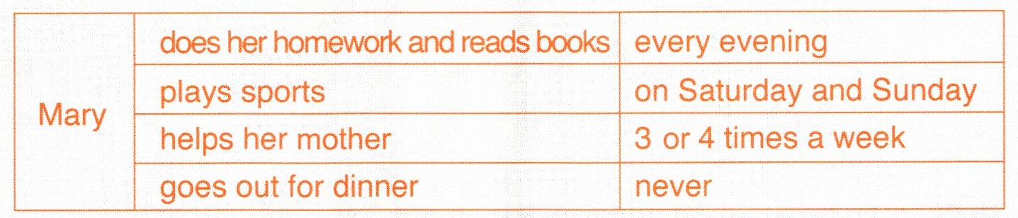 2) Mary plays sports on Saturday and Sunday. 3) Mary helps her mother three or four times a week. 4) Mary never goes out for dinner.