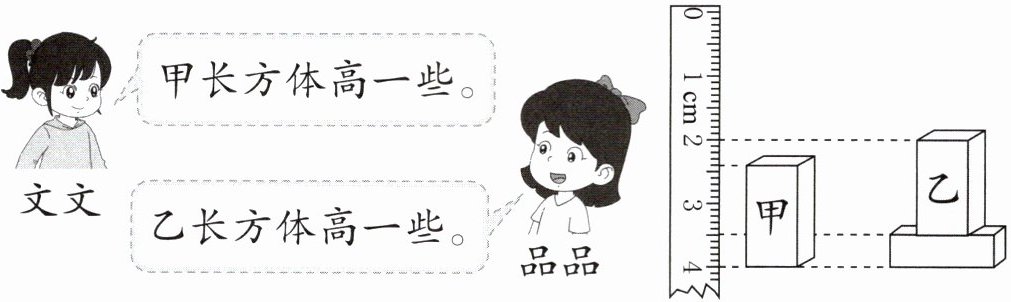 4. 拓展 考向 探究说理 文文和品品按照下面的方式比较甲、乙两个长方体的高度。你同意谁的说法呢?请说明理由。