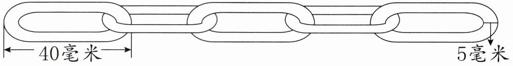 【解析】1 个铁环长 40 毫米,因为 40 毫米=4 厘米,所以 5 个这样的铁环单独摆放总长度是 4×5=20(厘米),5 个连在一起拉紧后减少了 8 个 5 毫米,也就是减少 5×8=40(毫米),40 毫米=4 厘米。因此拉紧后的总长度是 20-4=16(厘米)。