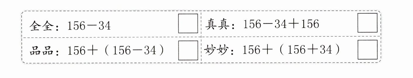 4. 拓展 考向 探究说理 为庆祝元旦,三(1)班用气球装扮教室,其中红气球有156个,蓝气球比红气球少34个,两种气球一共有多少个? 下面是几位同学的列式,请你在正确算式后面的 里画“√”,并从4人中选择一个说明理由。