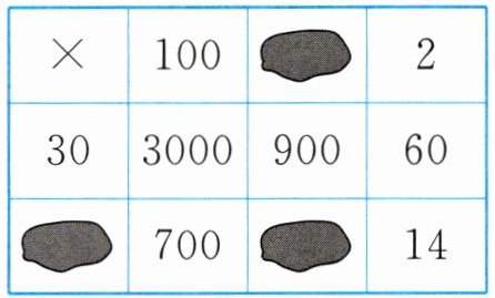 C【解析】表格里是一个三位数乘两位数的计算,中间的900对应左边的30和上面的阴影遮住的数,因为30×30=900,所以上面的阴影遮住的数是30,同理得到左下角的阴影遮住的数是7,所以这个算式是132×37,选C。