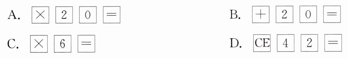 8. 用计算器计算$114×24$,笑笑依次按键$\boxed{1}\ \boxed{1}\ \boxed{4}\ \boxed{×}\ \boxed{4}$,发现第二个乘数漏按了$2$,她接下来这样按键,其中正确的是(