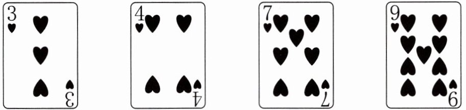 2. 请根据下面4张扑克牌上的点数(每张扑克牌都要用上且只能用一次),想一想经过怎样的运算才能得到24,列出综合算式: