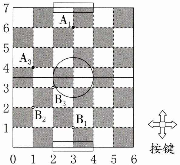 (3) 面对球员 $A_3$ 的突围,球员 $B_1$ 需要前往(5,3)处拦截,请在图上画出 $B_1$ 的移动路线,数一数至少需要按( )次按键。(每按一次按键只能移动一格,而且不能斜移)