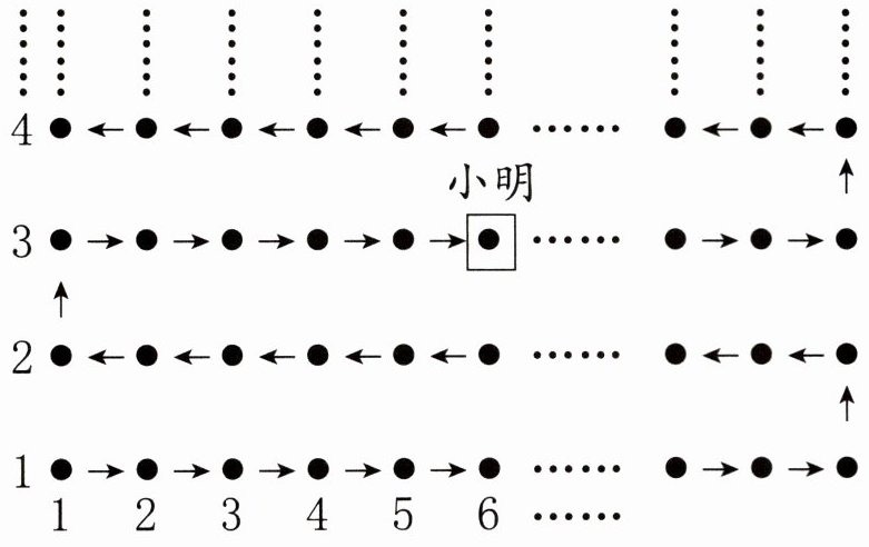 3. 实验小学举行队列表演,表演的同学编号是从 1 开始的连续整数。如图,从(1,1)开始,按编号从小到大的顺序沿箭头排成一个正方形实心队列。小明的编号是 30,他的位置用数对表示是(6,3)。请问共有多少名同学参加队列表演。