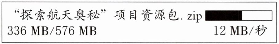 4. 提升 科学社团的同学们准备开展“探索航天奥秘”的研究,需要下载容量为576 MB的项目资源包,已下载336 MB,当前下载速度是12 MB/秒。下载界面如图所示。按照当前的下载速度,下载完整个项目资源包还需要多少秒?