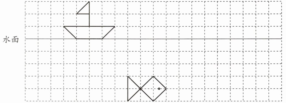 (1)画出小船的倒影。 (2)再画3条小鱼,使4条小鱼连成一串。