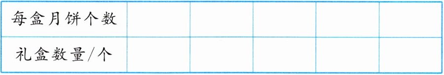 3. 中秋节吃月饼和赏月是中国各地过中秋节的习俗。中秋节妈妈打算把 72 个月饼装在若干个礼盒里送人,每个礼盒的月饼数量一样多。每个礼盒的月饼不少于 6 个,不多于 20 个。有几种不同的装法? 请填写在表格中。