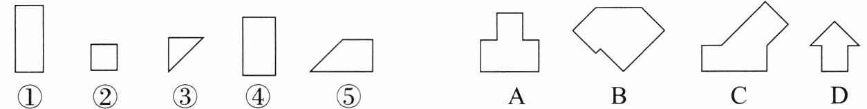 2. 提升 A、B、C、D四个图形是由①②③④⑤五个小图形中的哪两个组成的?先用虚线分出来,再填空。