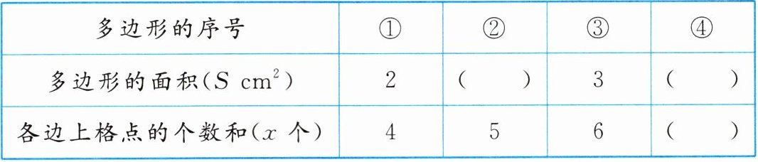 )。(2) 画出2个格点多边形,使每个多边形内部都有且只有2个格点。此时所画的各个多边形的面积$S cm^2$与它各边上格点的个数和x个之间的关系式为S= (