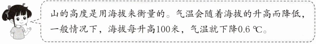 山的高度是用海拔来衡量的。气温会随着海拔的升高而降低,一般情况下,海拔每升高 $100$ 米,气温就下降 $0.6^{\circ}C$。