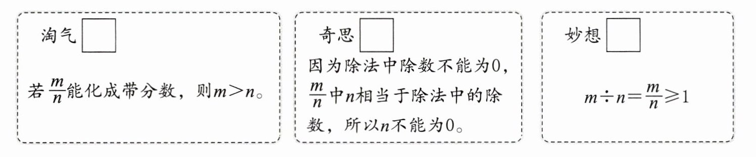 5. 拓展 新考向 探究说理 下面是三位同学关于$m÷ n= \frac{m}{n}(n\neq0)$的说法,谁的正确?在后面的$□$里画“√”并说明理由。