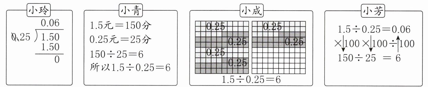 (1)下面是四位同学计算“1.5÷0.25”的方法,(