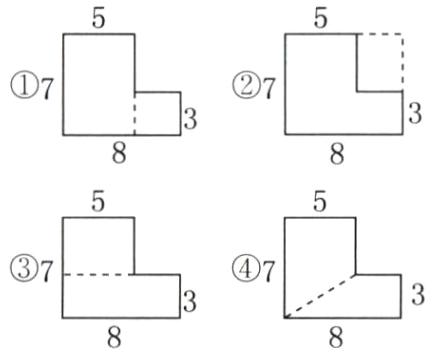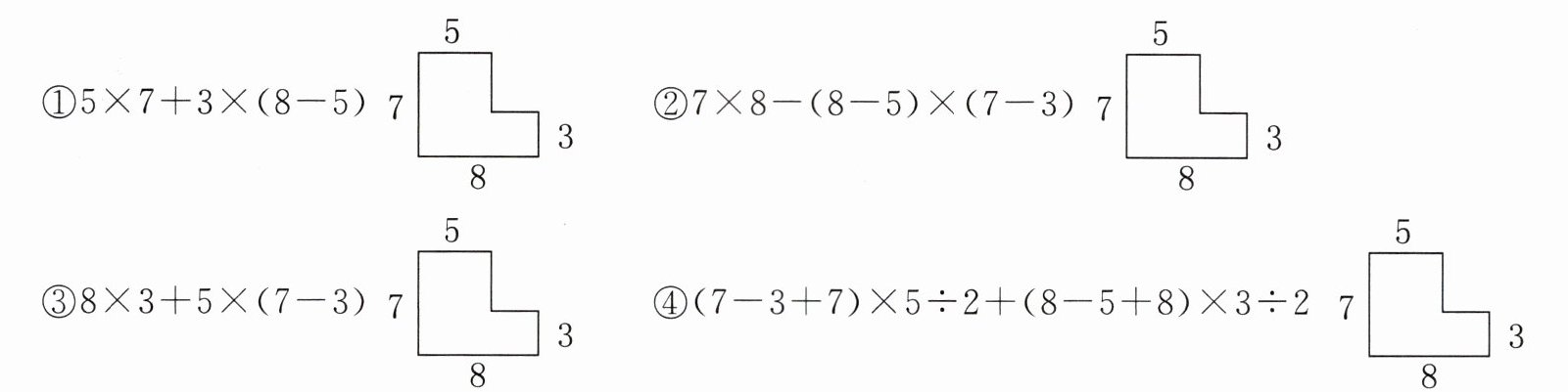 1. 基础 求下面图形的面积有多种方法,根据给出的算式,在图中用虚线表示出割补方法。(单位:cm)