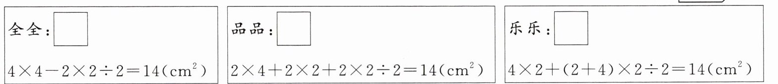 4. 拓展 新考向 探究说理 一张边长4cm的正方形纸,从相邻两条边的中点连一条线段,沿着这条线段剪掉一个角(如图所示),剩下的面积是多少平方厘米?下面是全全、品品和乐乐三位同学的解答方法。