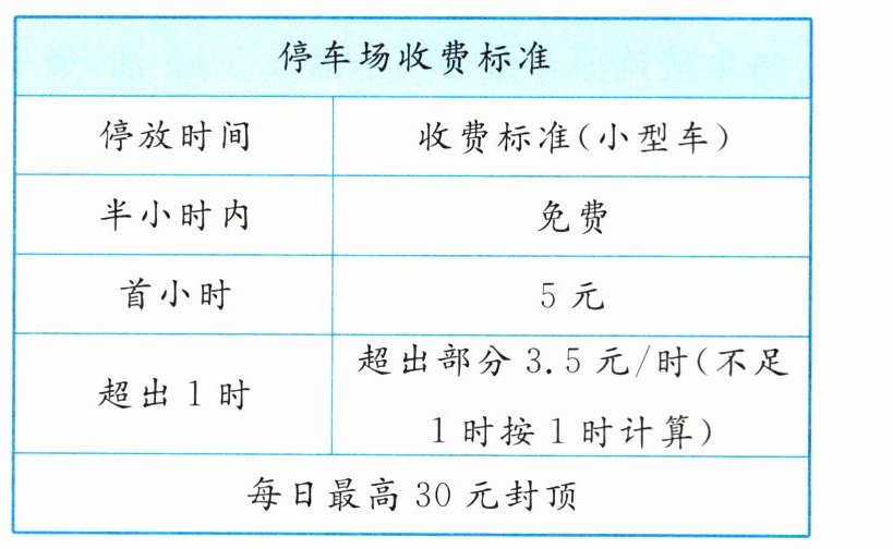 【解析】由题意可知首小时收费5元,超过1时的部分每时收费3.5元,所以用赵叔叔付的钱数减去首小时的钱,就是超过部分付的钱数,用超过部分的钱数除以3.5就是超过部分最多的时间,然后加上首小时就是一共的最多停车时间。