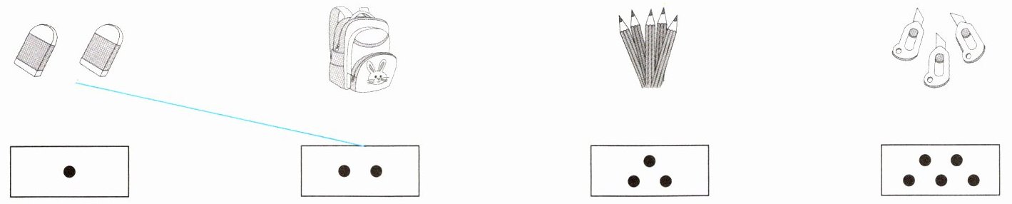 橡皮擦连第二个方框,书包连第一个方框,铅笔连第四个方框,小刀连第三个方框。