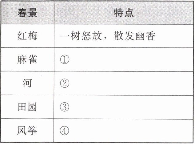 6. 在作者的笔下,春天的不同景物具有不同的特点。请根据文章内容,将下面的表格补充完整。
