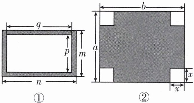 解 图①中阴影部分的面积为 $mn-pq$,图②中阴影部分的面积为 $ab-4x^{2}$. 当 $a=\frac{5}{2}$,$b=3$,$x=\frac{1}{2}$ 时,$ab-4x^{2}=\frac{5}{2}× 3-4× \left(\frac{1}{2}\right)^{2}=\frac{15}{2}-1=\frac{13}{2}$.