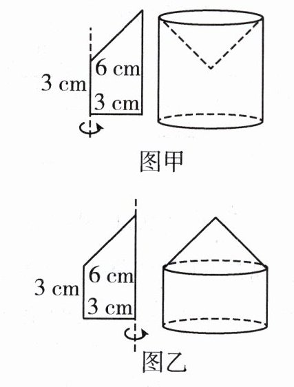 (1)小红(2)甲的体积:$\pi×3^{2}×6-\frac{1}{3}\pi×3^{2}×(6-3)=54\pi-9\pi=45\pi(cm^{3})$,乙的体积:$\pi×3^{2}×3+\frac{1}{3}\pi×3^{2}×(6-3)=27\pi+9\pi=36\pi(cm^{3})$,所以$45\pi:36\pi=5:4$. 综上,甲、乙两个立体图形的体积比是$5:4$.