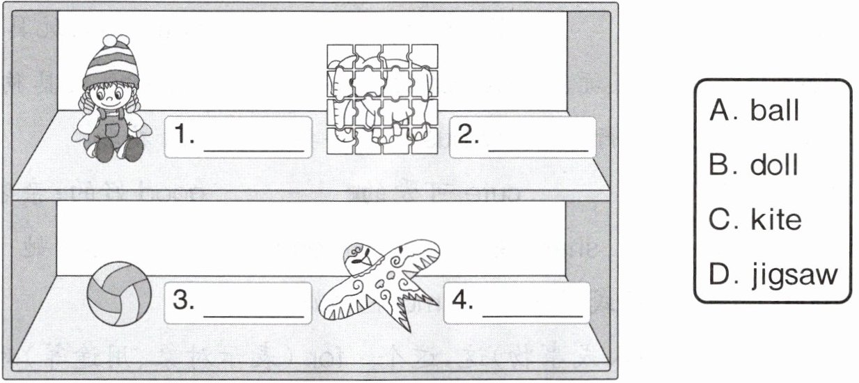 “玩具小铺”要开业了,请你帮忙做准备工作。选单词,将玩具标签摆放到合适的位置。