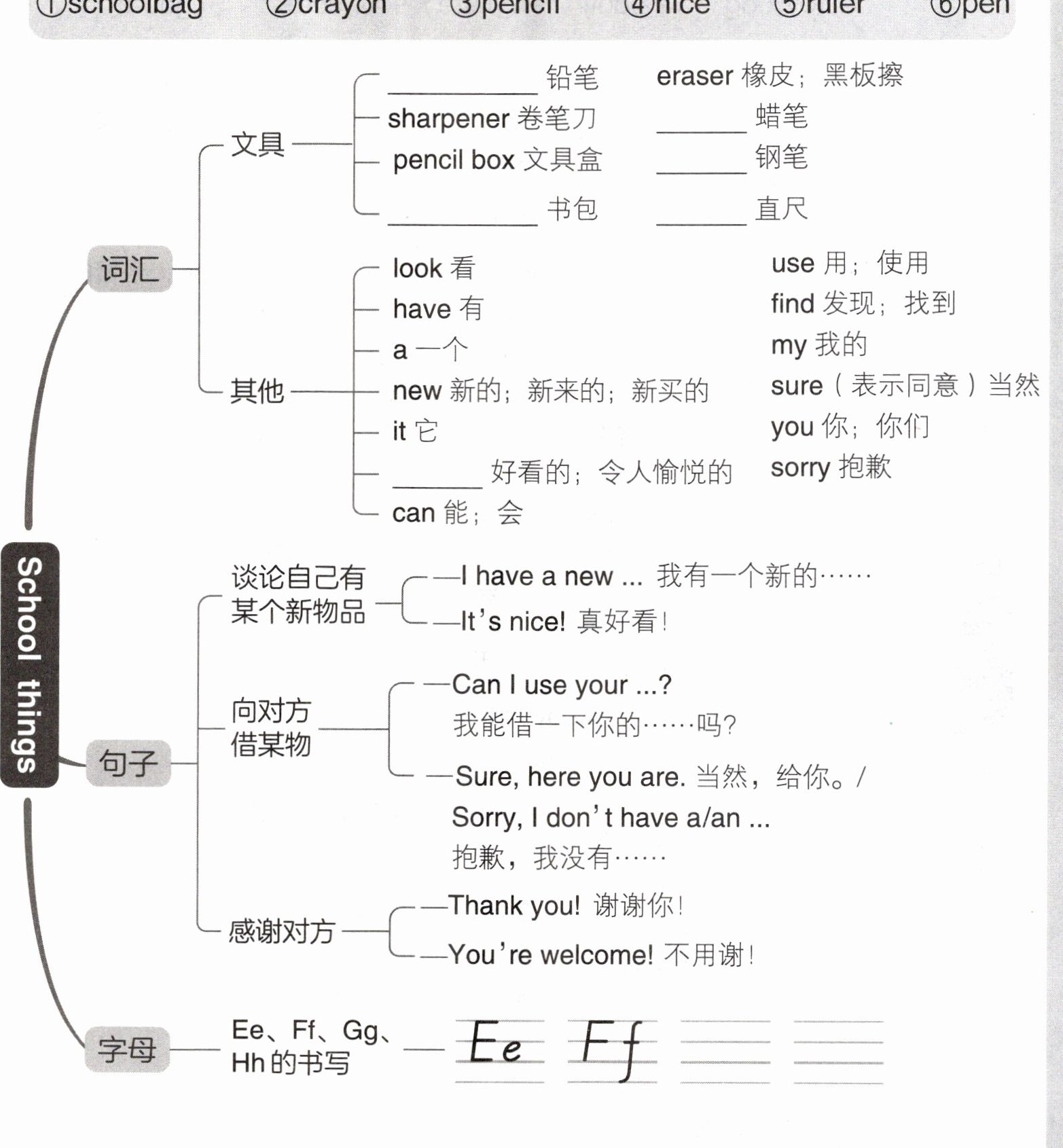 - 字母:Ee、Ff、Gg、______ ______ ______ Hh 的书写