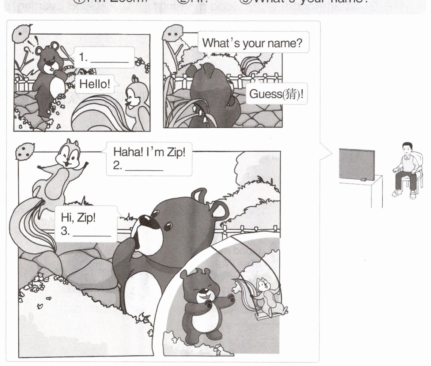四 为了提高英语水平,Jiaming 正在家里看英语动画片。观察画面,选择合适的句子,补全对话。