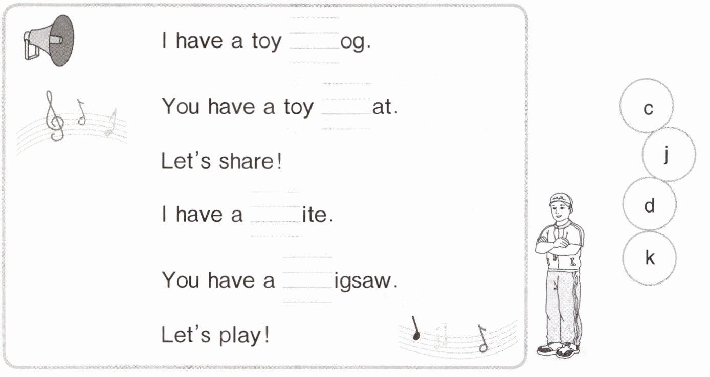 二 营长正在教大家唱开营歌谣。写字母,补全单词,完成歌谣。