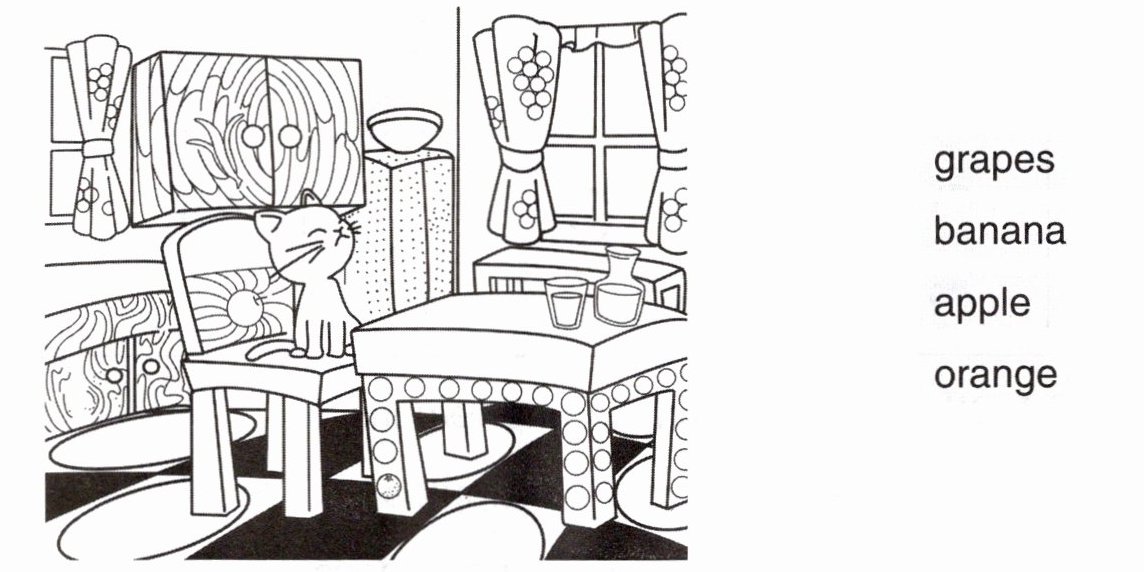 一 考眼力。将图中隐藏的水果涂上你喜欢的颜色并连一连。